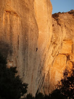 The sun came out and we ran at its call - the first day vising for the first time for me the impressive conglomerate heaven of Raco de Missa, one of the sport climbing sectors developed within the Montsant mountain. It figures already in the new Montsant guidebook, as well as in the end of the Siurana guidebook - thus the number of people visiting is rather high - despite the grueling approach of 30 min uphill walking. The spot is spectacular, especially at sunset, with views down the valley, all the way to the Siurana 'island in the sky', the col, and the villages in the valley. The routes are very good too - long, conglomerate monsters, using up all of the 40, or even 50 meters of rope (see picture of myself toproping Llarg, a very very long route to end the day completely pumped and useless, previous more 'mystical' post).